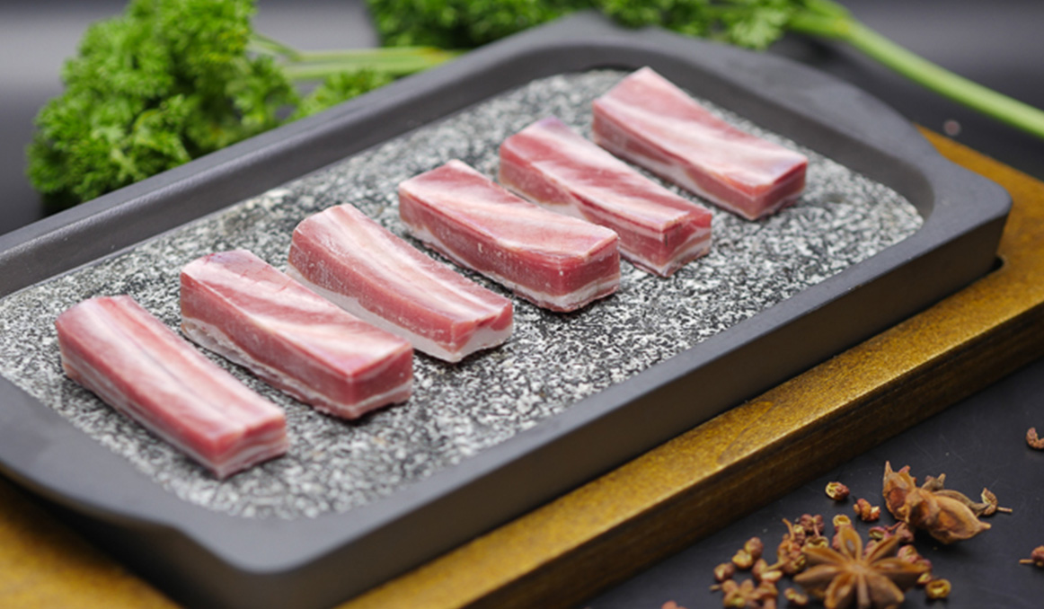 脊椎骨(7-11肋)兩側(cè)部位肉,部位肉酮體占3.6%,表面去風干肉、淤血肉及軟硬骨,保留自然脂肪,肉質(zhì)紅白相間,呈大理石花斑紋狀,肉質(zhì)細嫩,脂肪含量較高,香甜多汁,不干澀。