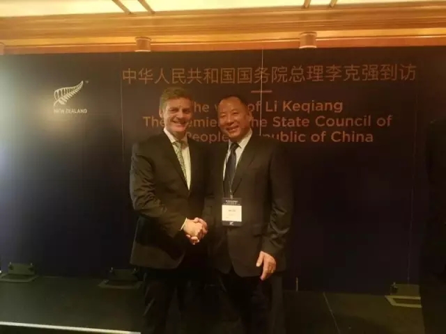 大莊園實業(yè)集團董事長陳希濱與新西蘭總理比爾·英格利希在李克強總理訪問新西蘭歡迎午宴上會面握手并親切交談