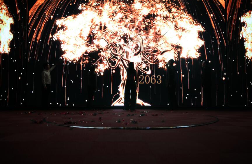 晚會的最后,以陳姣姣為首的集團五名領(lǐng)導(dǎo)走上臺,代表董事長開啟了“希望之樹”。那棵象征著大莊園的“希望之樹”從1982年開始成長,一直長到了2019、2029、2059、2099……