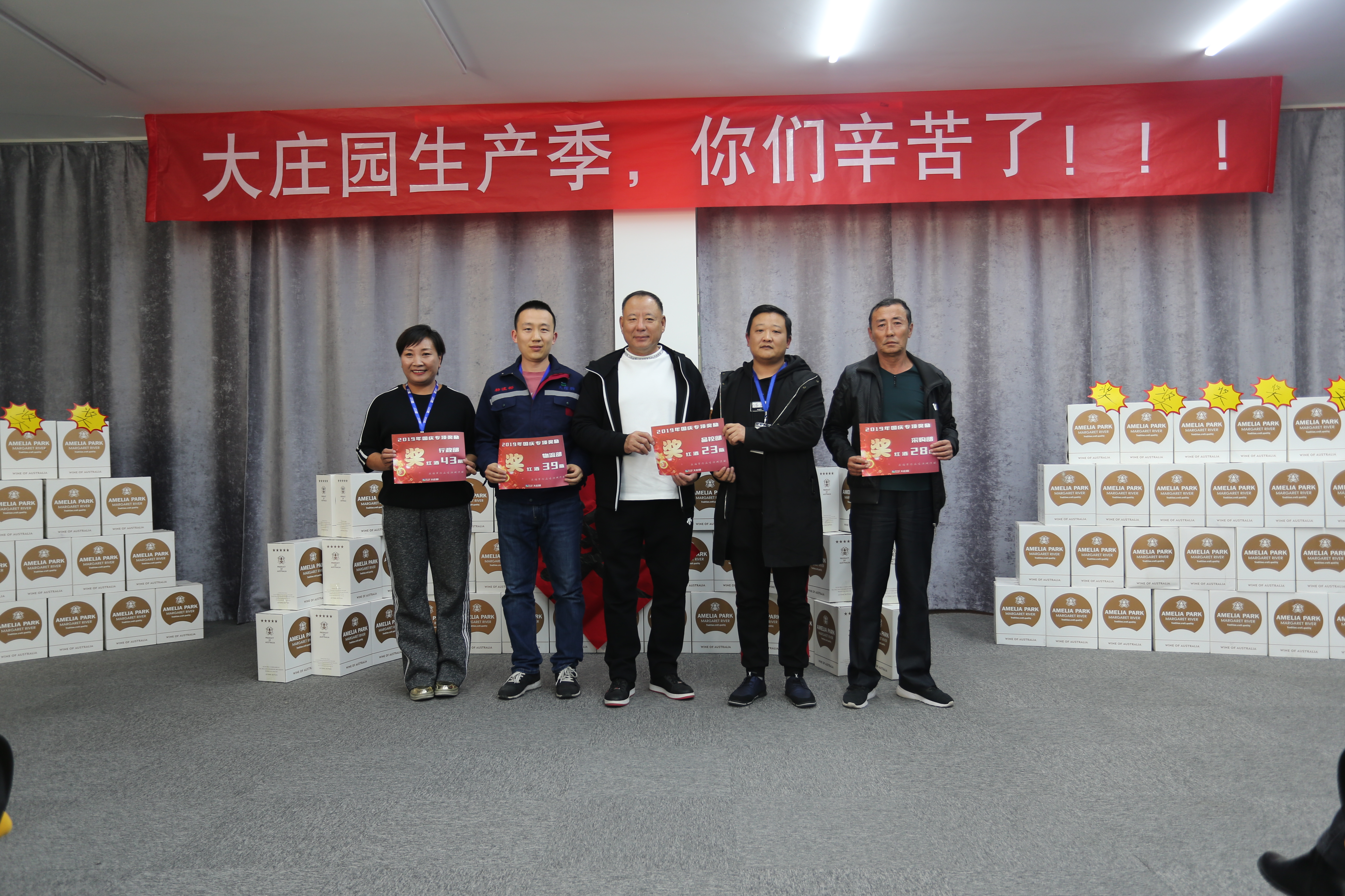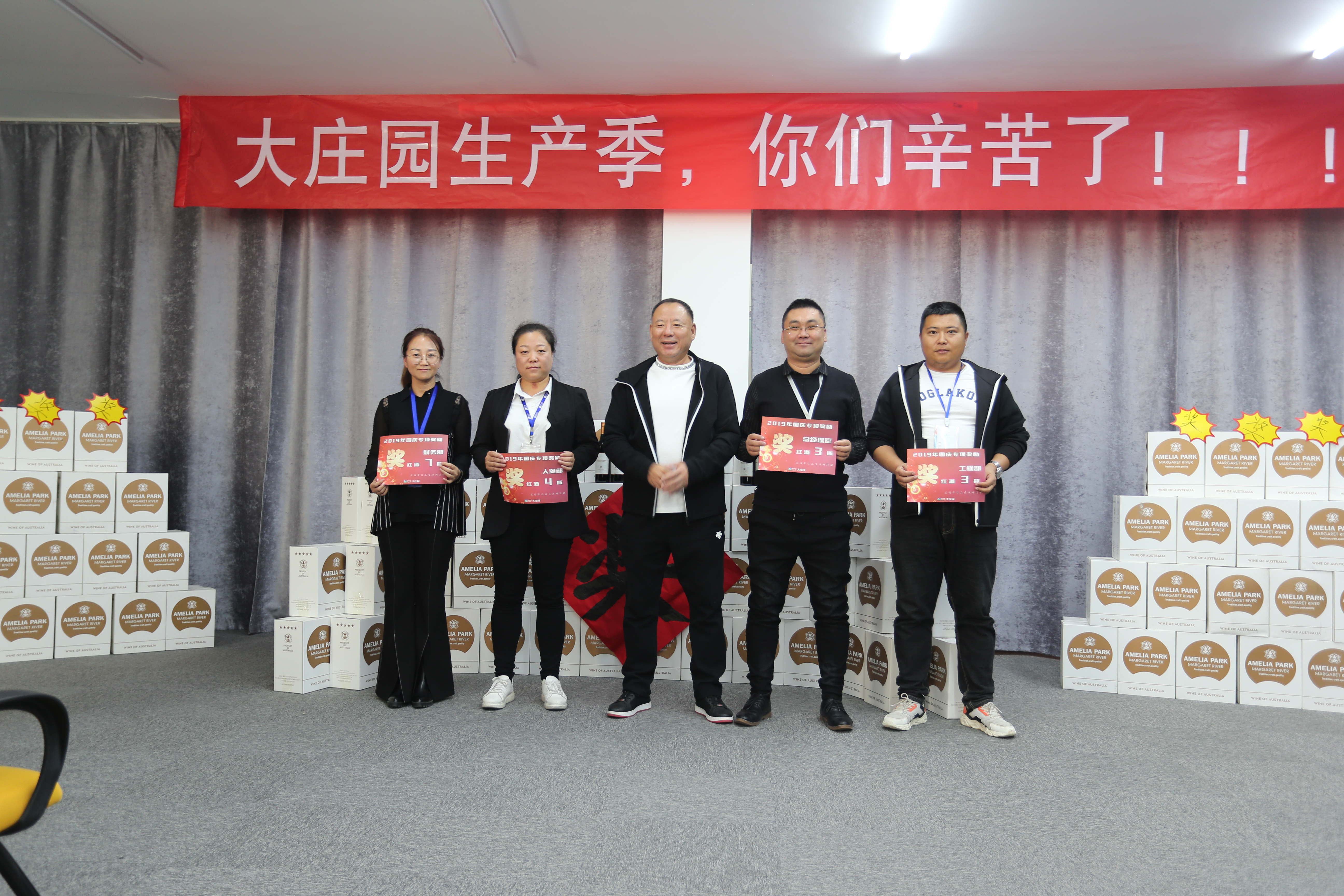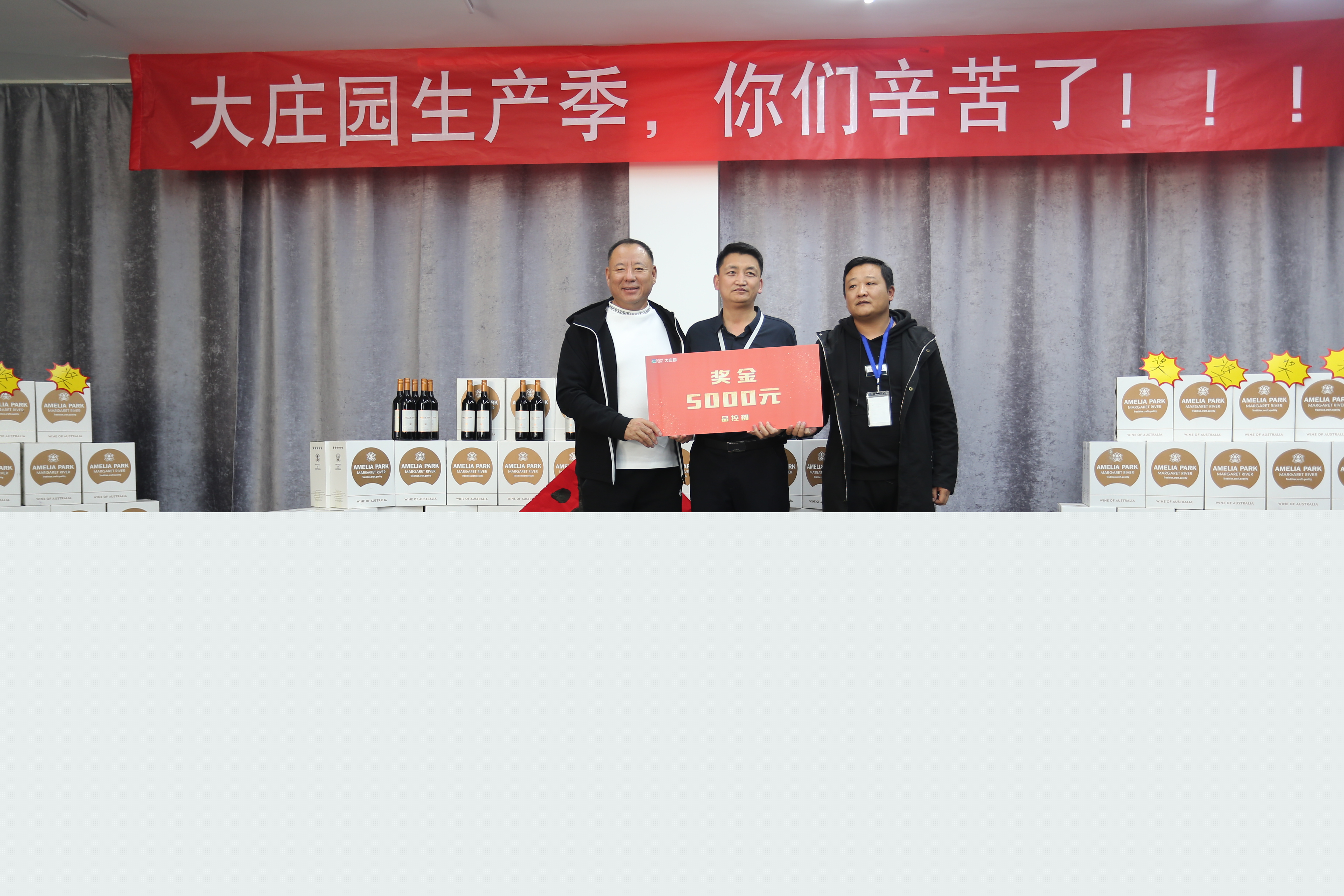 在全場如雷的掌聲中,大莊園集團(tuán)董事長陳希濱先生向連續(xù)十五天達(dá)成7000+的“主力軍”:生產(chǎn)部、采購部、品控部和設(shè)備部頒發(fā)了總額為10萬元的獎金,向全體節(jié)日期間堅持奮戰(zhàn)在工作崗位的員工頒發(fā)了“專項獎勵”——每人兩瓶價值不菲的澳洲紅酒。