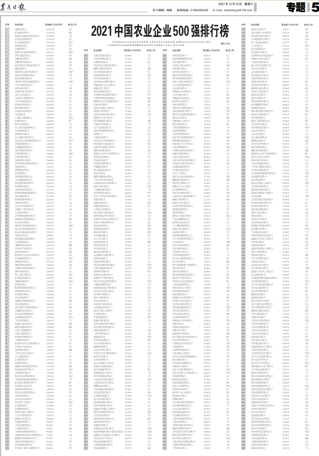 《農(nóng)民日報》是我國歷史上第一張面向全國農(nóng)村發(fā)行的報紙,是一份中央級、綜合性大報。2018年以來,農(nóng)民日報社連續(xù)推出四屆中國農(nóng)業(yè)企業(yè)500強榜單。2021年榜單參照國際通行評價辦法,由企業(yè)按照要求進行申報或采用公開數(shù)據(jù),依據(jù)2020年農(nóng)業(yè)企業(yè)營業(yè)收入排序產(chǎn)生,500強企業(yè)2020年營收范圍在12.47億元~5303.05億元之間。