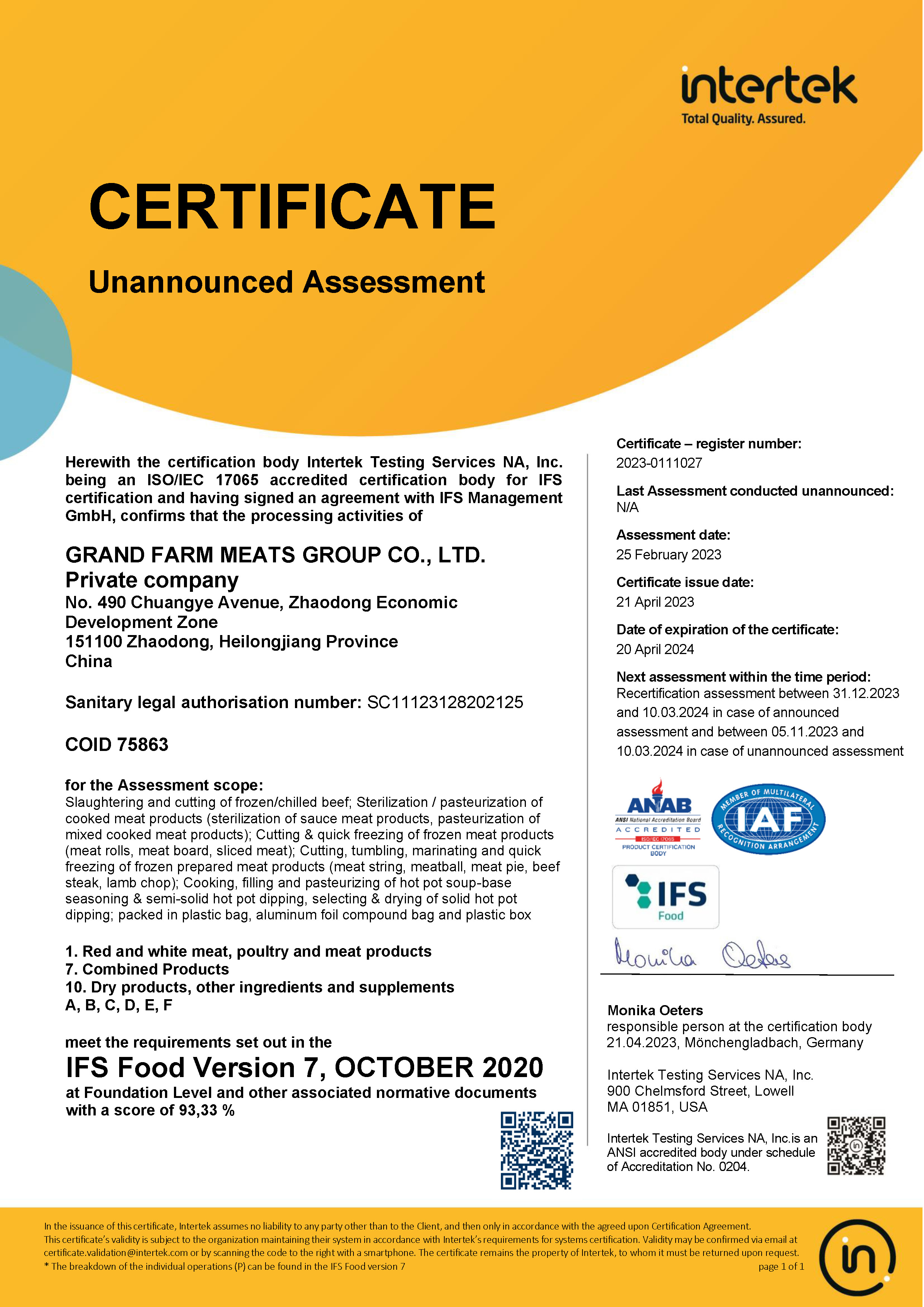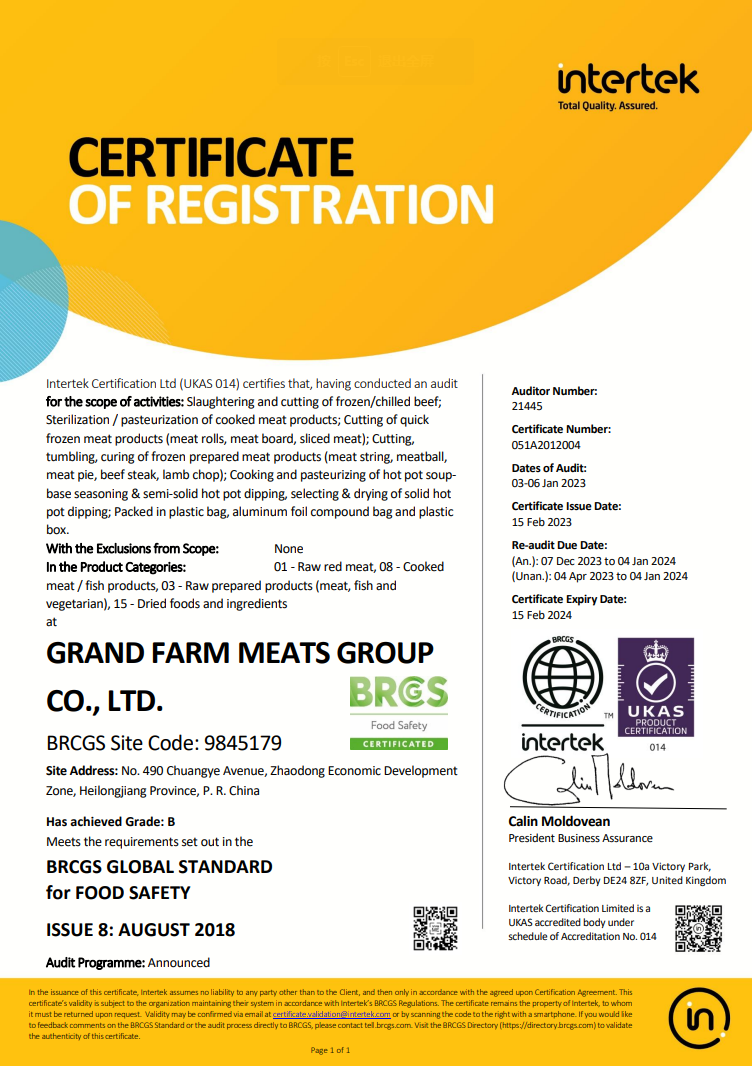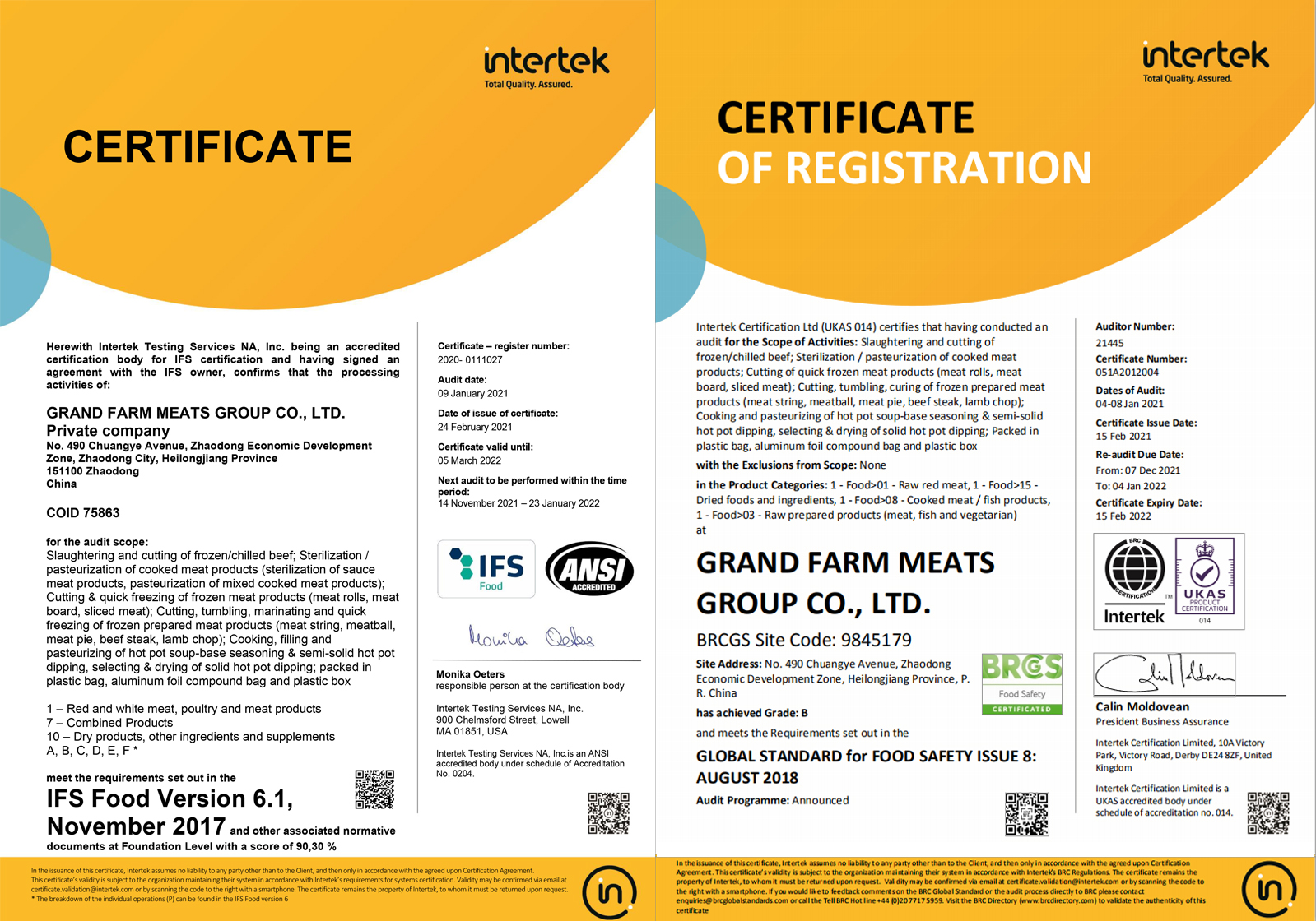 2021年1月,通過(guò)歐洲國(guó)際雙體系質(zhì)量認(rèn)證(BRCGS、IFS)。